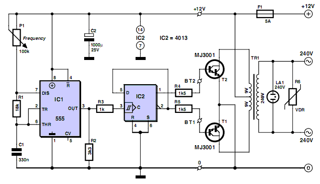 Though it is possible to build a more powerful circuit, the complexity caused by the very heavy currents to be handled on the low-voltage side leads to circuits that would be out of place in this summer issue. Let?S not forget, for example, that just to get a meager 1 amp at 230 VAC, the battery primary side would have to handle more than 20 ADC!. The circuit diagram of our project is easy to follow. A classic 555 timer chip, identified as IC1, is configured as an astable multivibrator at a frequency close to 100 Hz, which can be adjusted accurately by means of potentiometer P1.